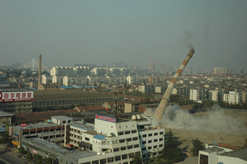 ----為全市實現“十一五”節能減排目標作出貢獻 11月8日下午3點整,隨著一聲悶響,位于南通熱電公司內一根有30年歷史的煙囪,順著設定的東南方向緩緩倒下,這標志著西城區集中供熱項目最后掃尾工作順利完成。 被爆破的煙囪高約80米,建于1980年,是由南通人自己建造的第一座高層煙囪,也是主城區最高的煙囪。去年,市委、市政府決定關停南通熱電和江山熱電,統一由大型供電企業集中供熱、供電。兩家熱電廠的關停,年可節約標準煤10萬噸、減排SO2約2800噸,為市區實現“十一五”節能減排目標作出重大貢獻。