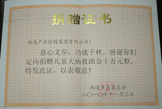 在本月初召開的“2010年慈善南通主題專場文藝晚會”上,產(chǎn)控集團(tuán)及其控股的上市公司南通科技和江山股份聯(lián)袂上臺接收市慈善總會發(fā)給的捐贈證書,被與會者視為佳話。 據(jù)悉,為幫助我市患大病(白血病、先天性心臟病、尿毒癥、惡性腫瘤)兒童,產(chǎn)控集團(tuán)定向捐贈兒童大病救助基金10萬元,南通科技和江山股份各捐贈20萬元,合計50萬元。