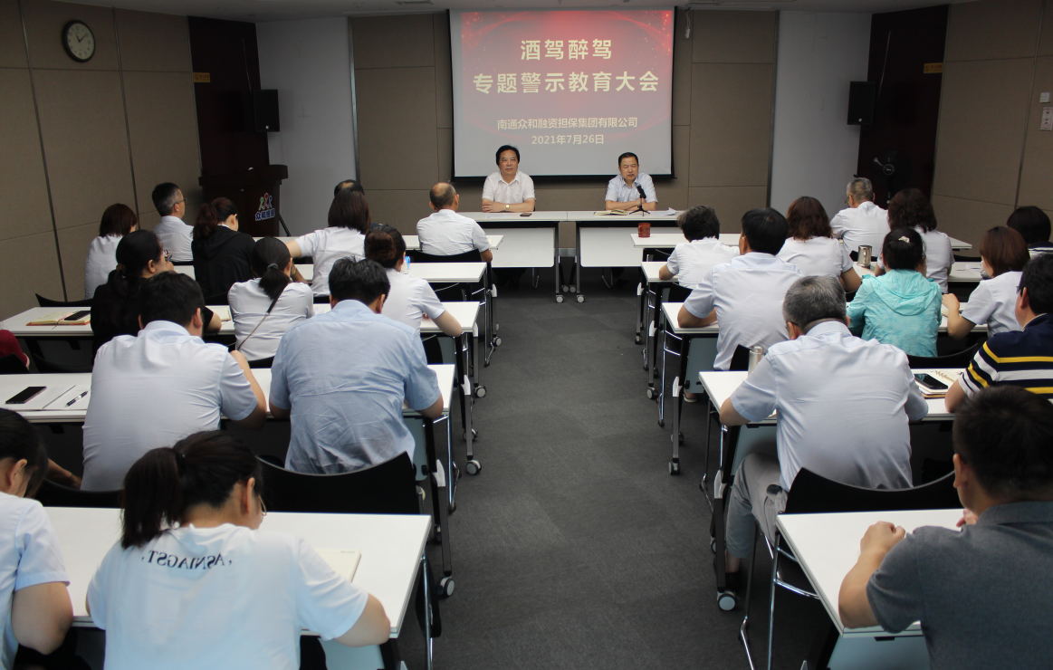 為深入貫徹落實產控集團關于開展“酒駕醉駕專題警示教育”通知要求,進一步強化酒后駕車警示教育,有效預防和堅決遏制公司干部職工酒駕醉駕等違法違紀行為的發生,7月26日上午,南通眾和融資擔保集團有限公司召開酒駕醉駕專題警示教育大會,本部全體干部職工、子公司中層以上干部近60人參加會議,黨支部書記何葉主持會議。